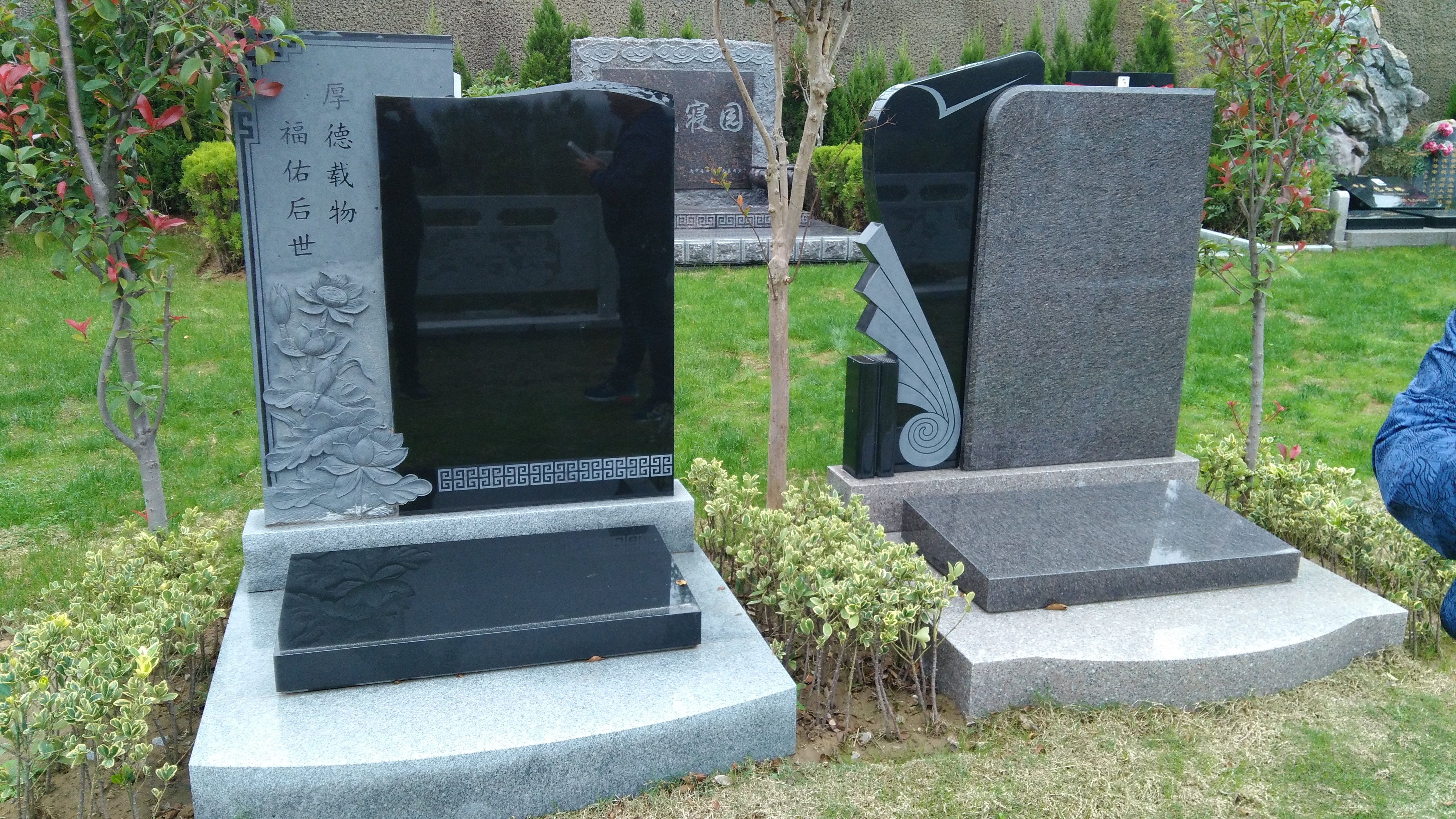 墓碑擁有文化底蘊(yùn),有了靈動(dòng)性,有了性情美。人世一頁(yè)書,如詩(shī)如畫,天壽的藝術(shù)墓碑可以讓人生詩(shī)詞末端點(diǎn)睛再續(xù)輝煌,可以讓人生詩(shī)畫再添續(xù)集。。悼念者們?cè)谀骨八蜕弦慌貂r花,與墓后方的一池碧水,一株柳樹(shù)交相輝映,更顯生機(jī)和浪漫。